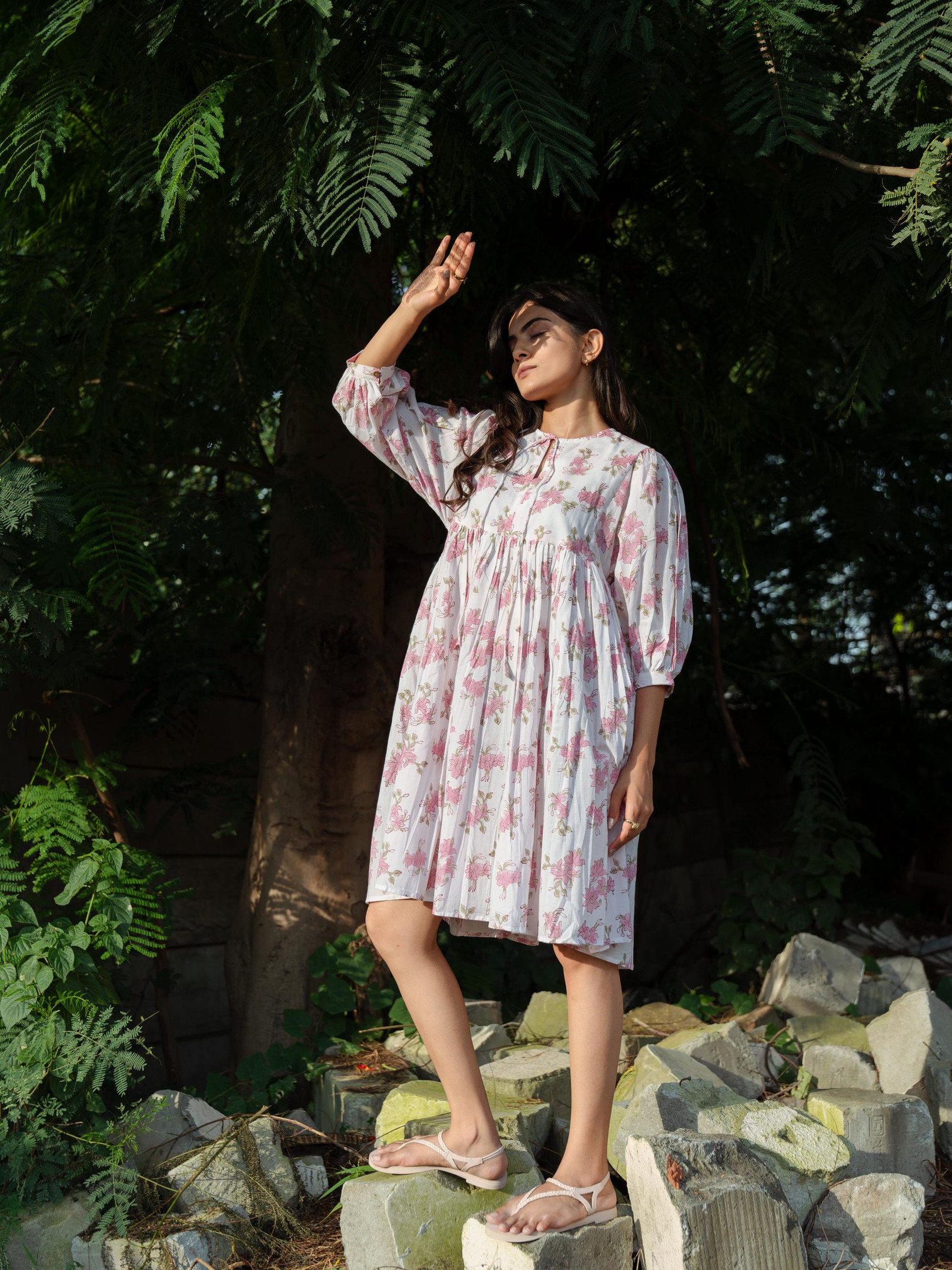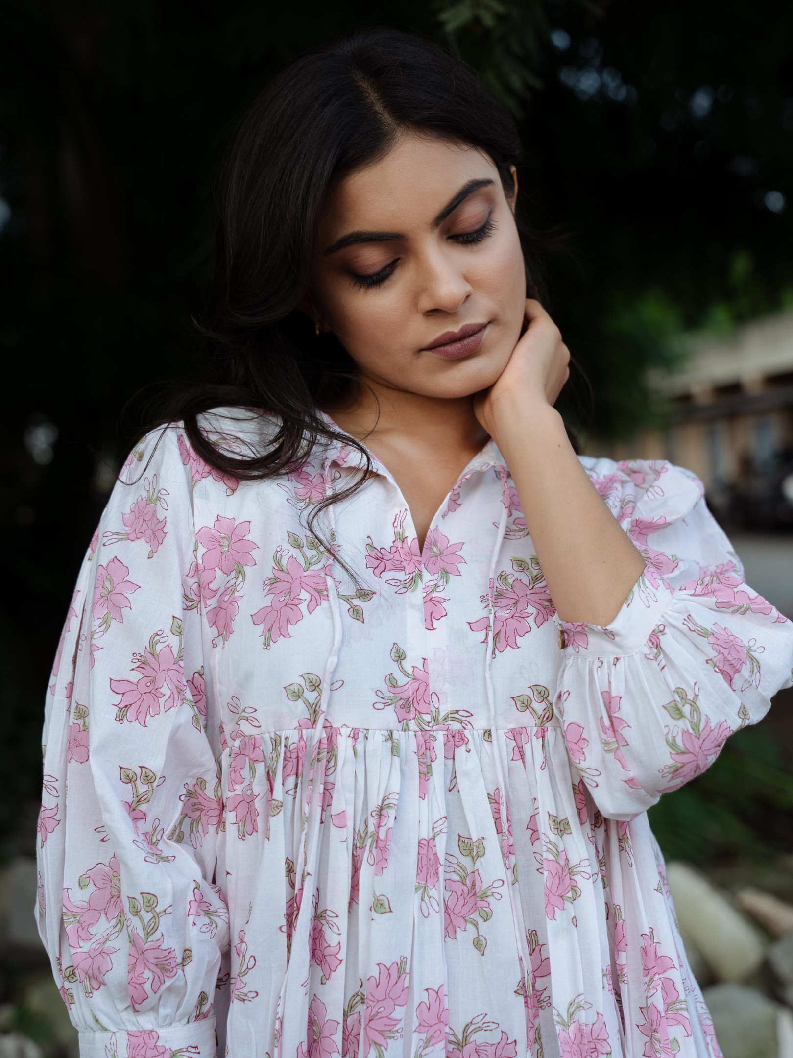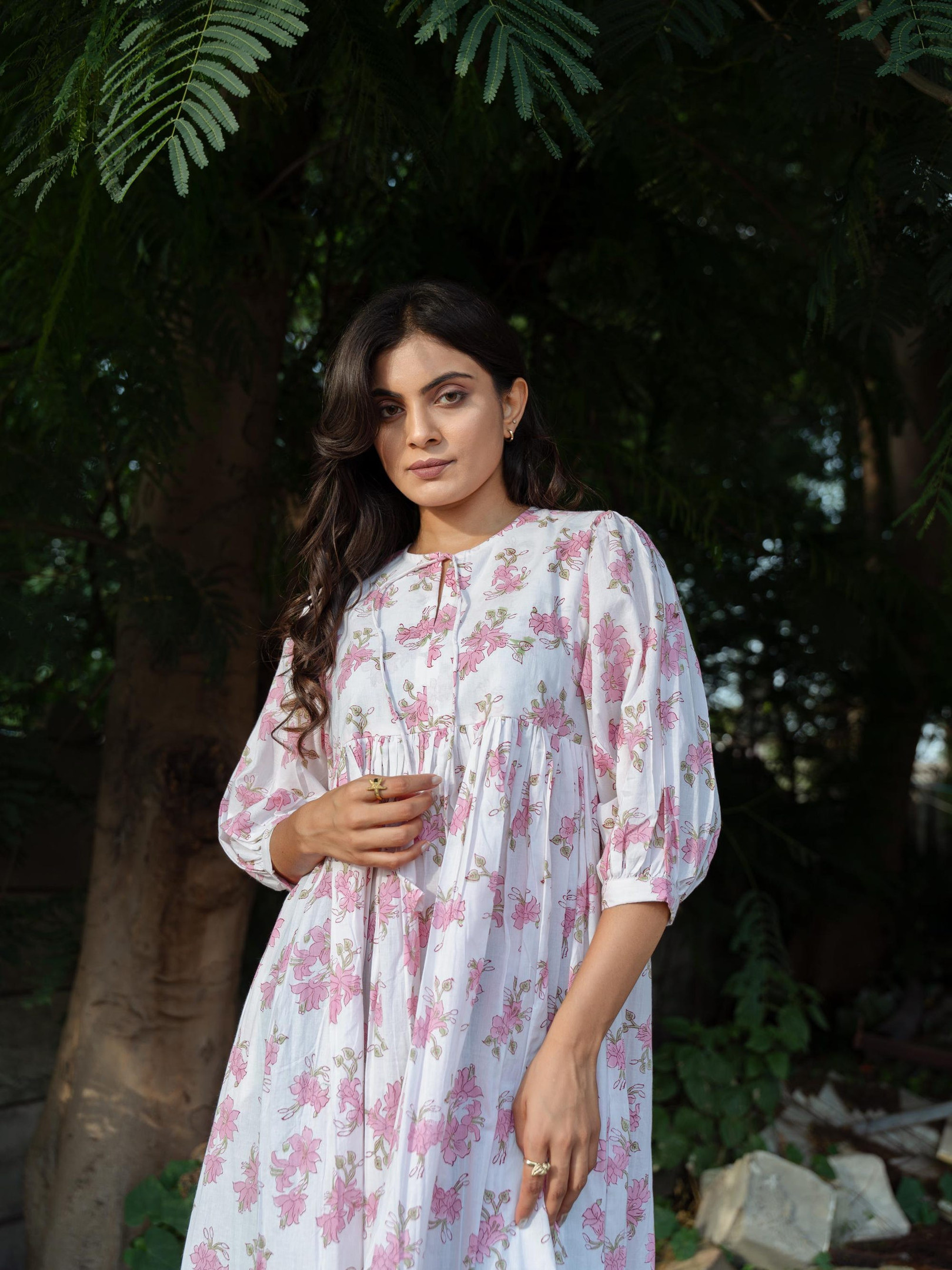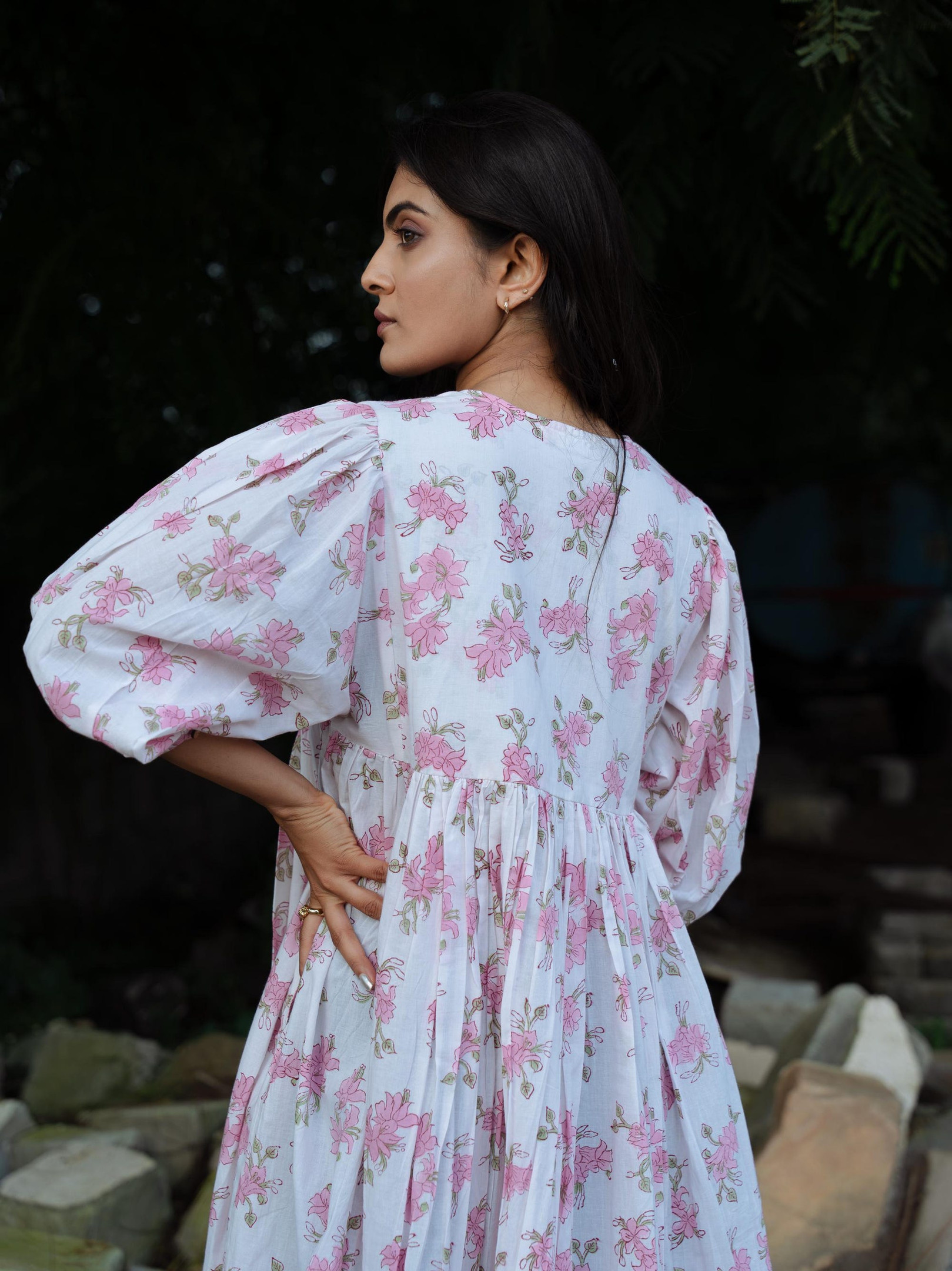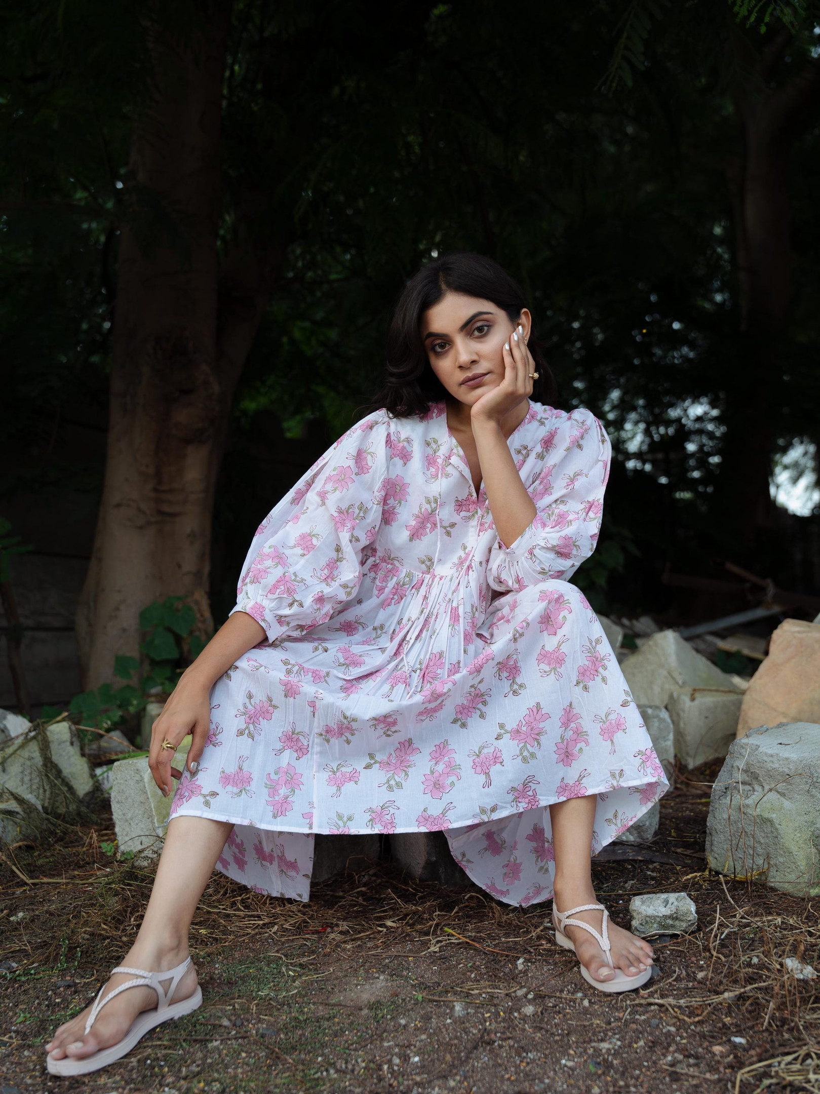 A white hand block-printed dress crafted using traditional techniques. The print has its natural flaws that define the uniqueness of block printing. Added pockets on both side for functionality. With only a limited number made, our dresses are a rare find cherished by women across the globe.