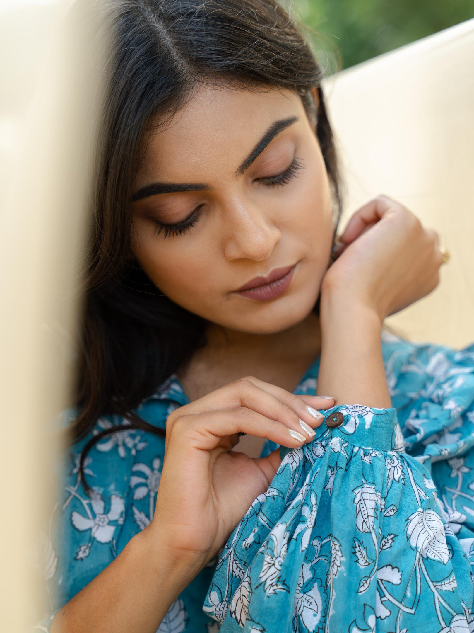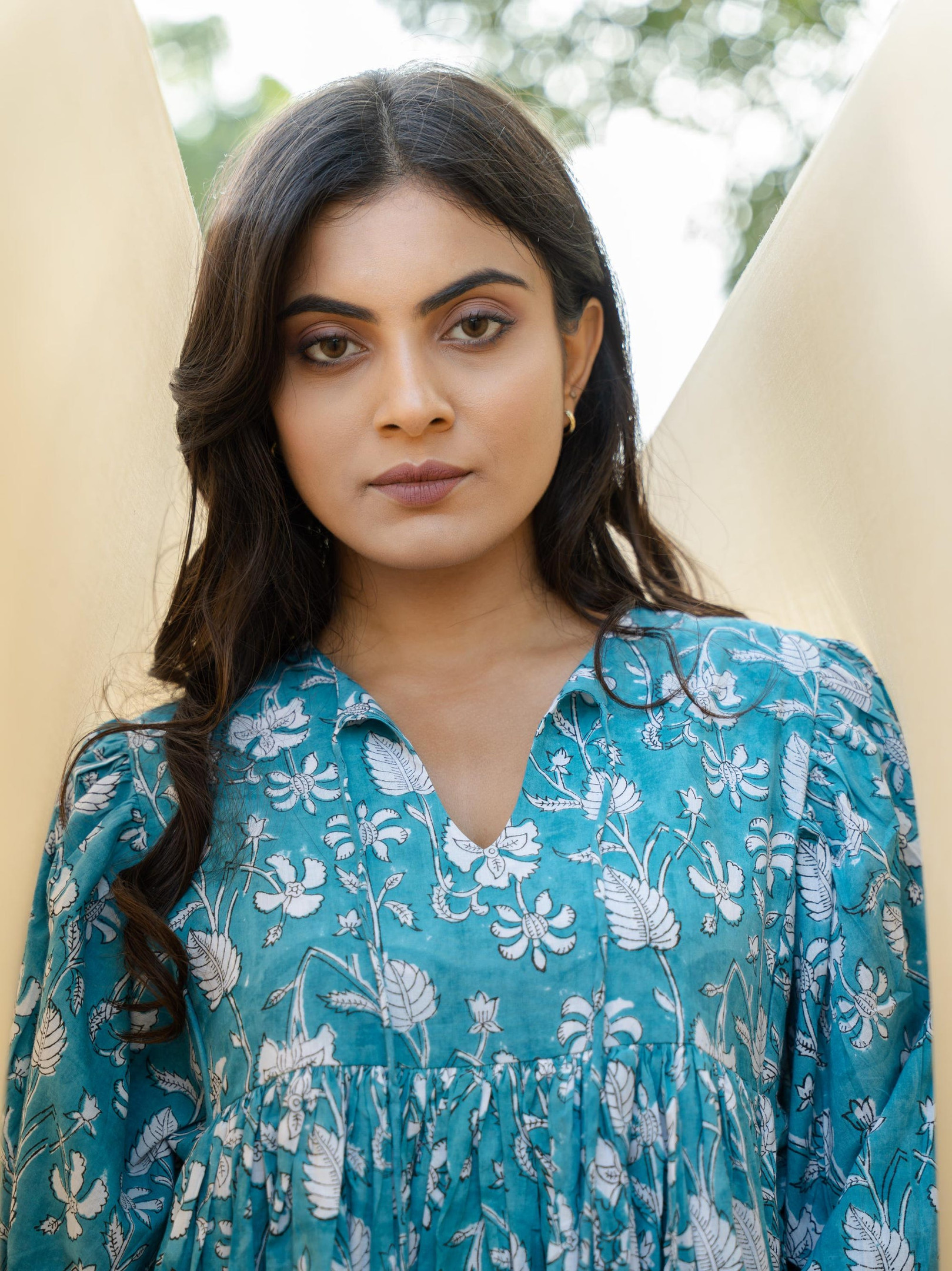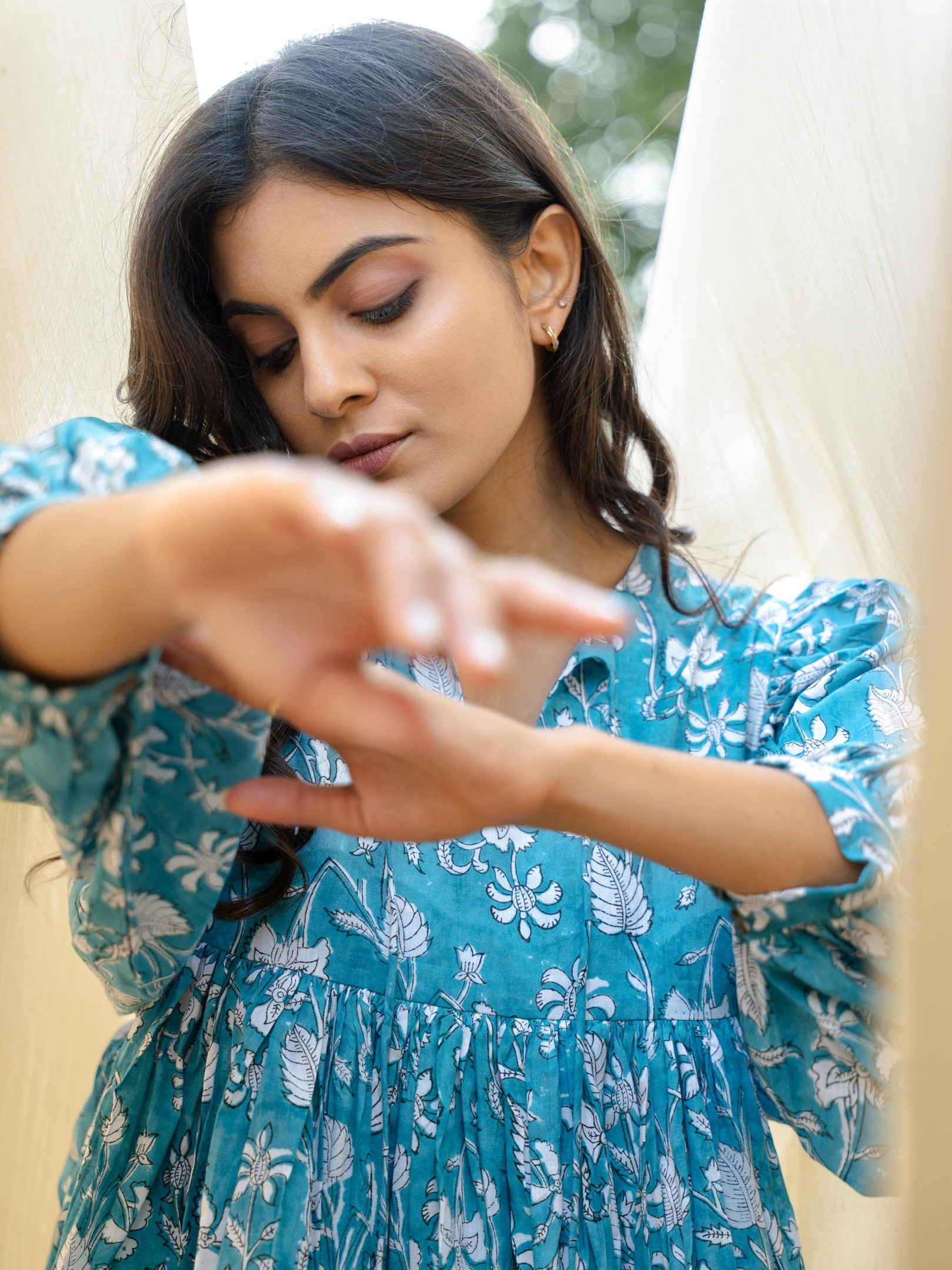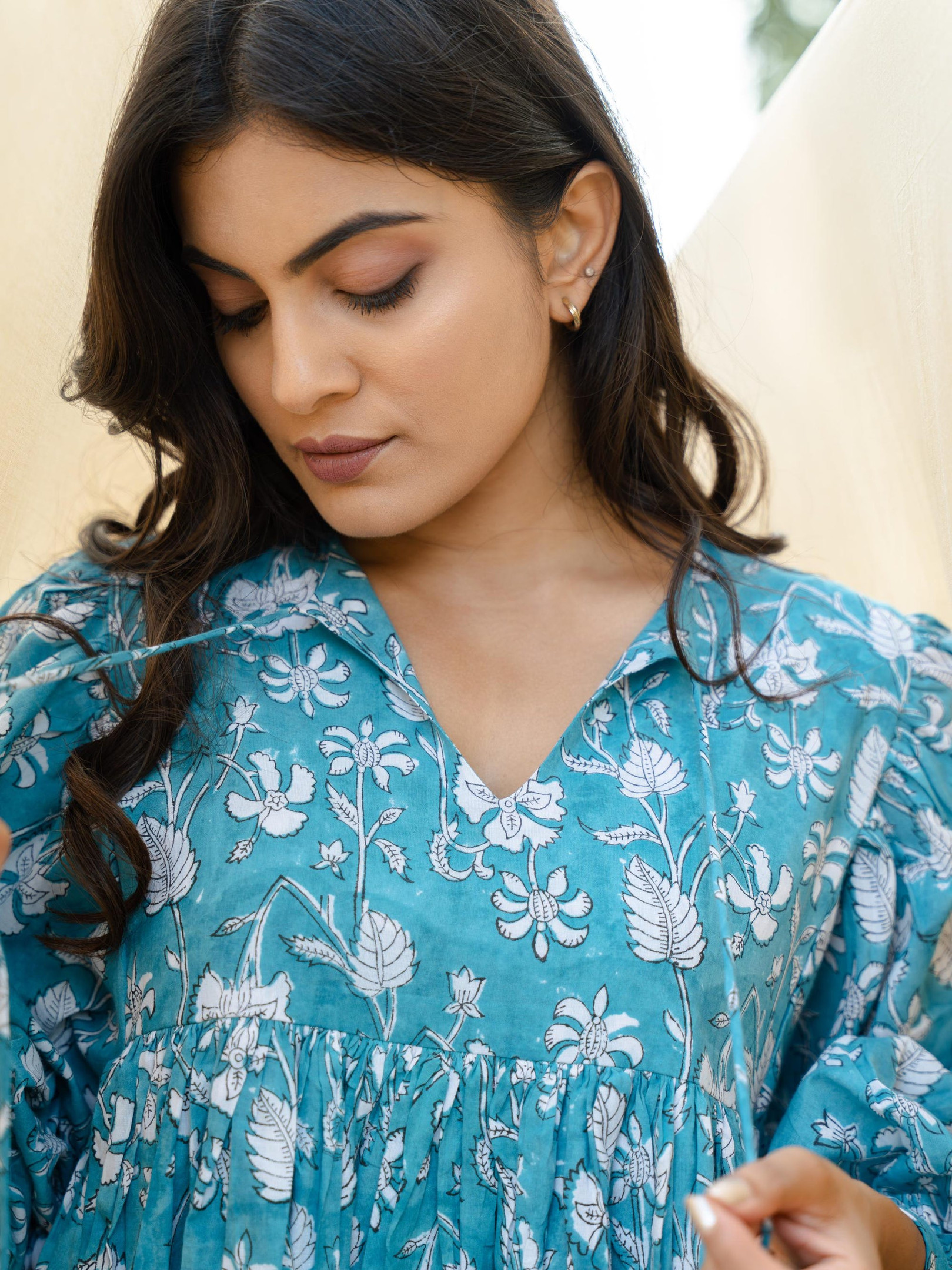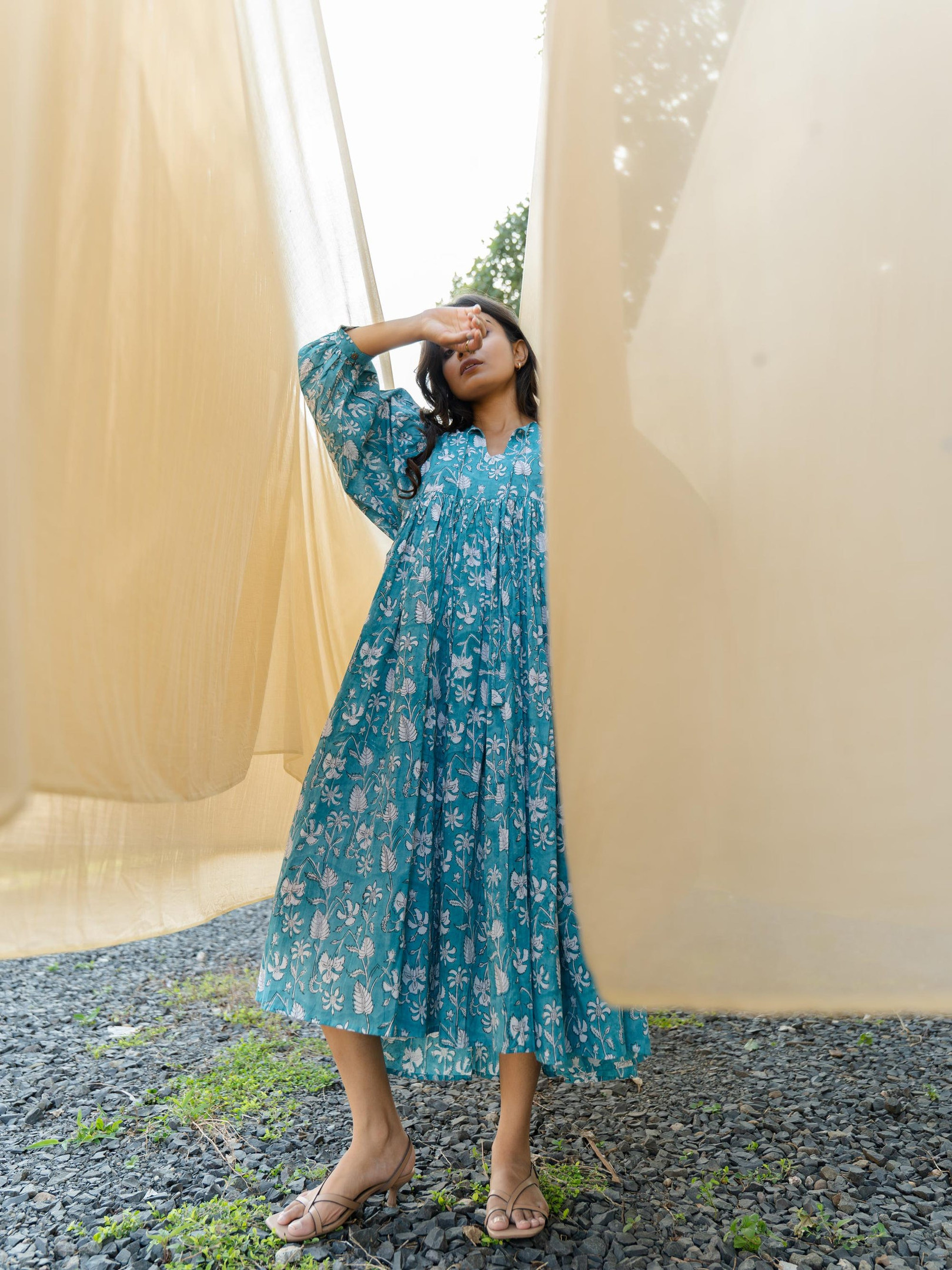 A turquoise hand block-printed dress crafted using traditional techniques. The print has its natural flaws that define the uniqueness of block printing. Added pockets on both side for functionality. With only a limited number made, our dresses are a rare find cherished by women across the globe.