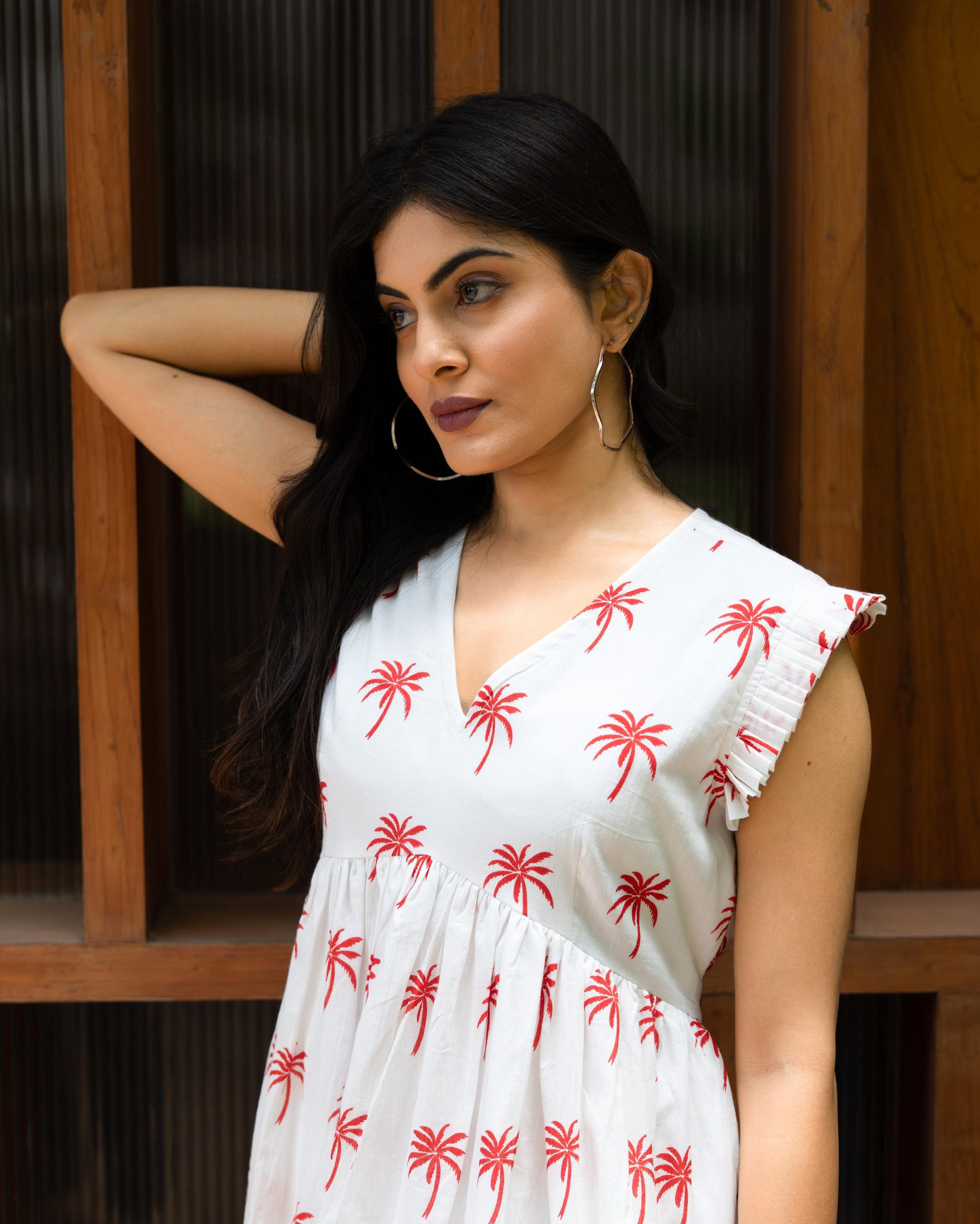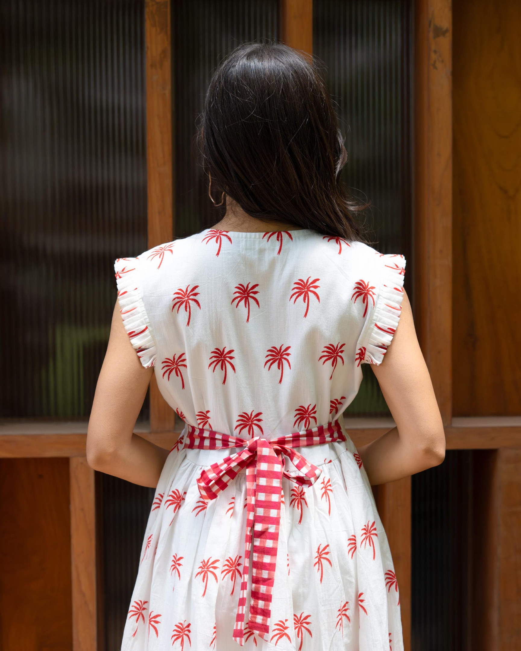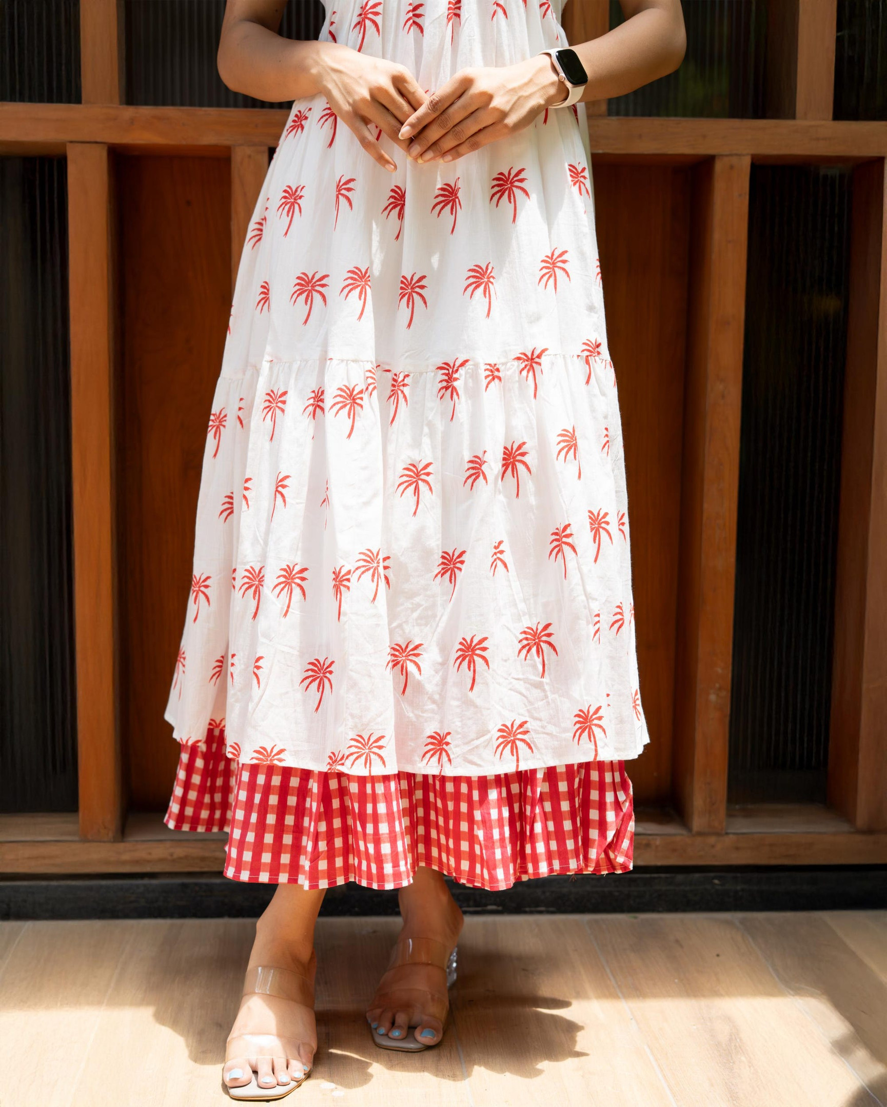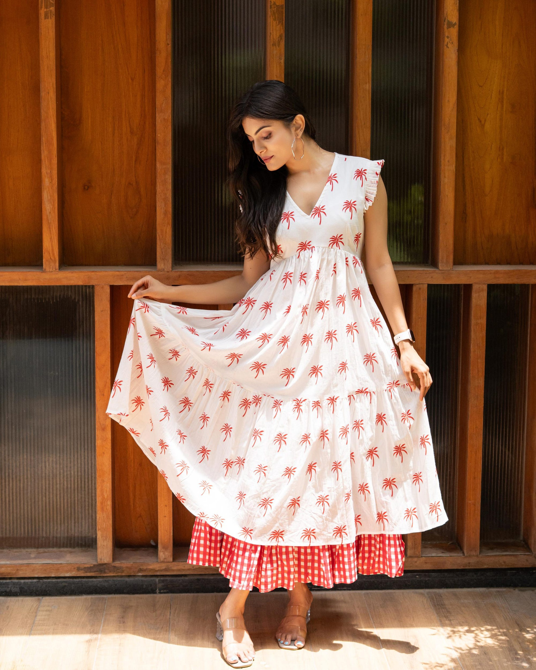 This exquisite fusion-style layered midi dress boasts a delicate ruffled cap sleeve, intricate hand block style palm motifs, and a flared silhouette that falls elegantly below the knee. The striking gingham layer adds a playful touch of contrast and structure, creating a visually appealing look that’s sure to turn heads. With its pure cotton fabric and handmade craftsmanship, this midi dress is perfect for making a statement while keeping you comfortable all day long.